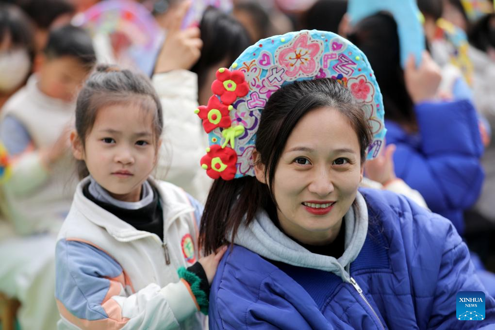 A woman learns the skill of making flowery headwear with her daughter during an event celebrating the International Women's Day in a kindergarten in Huangshan City, east China's Anhui Province, on March 6, 2025. Various activities are held across the country to mark the International Women's Day. (Photo by Fan Chengzhu/Xinhua)
