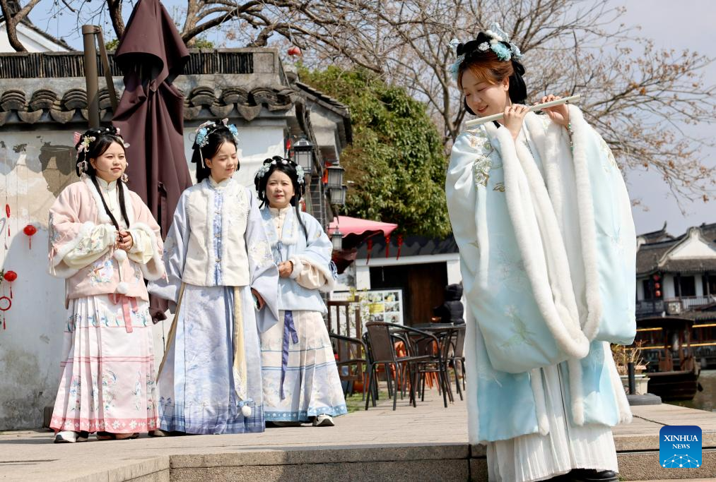 Women in traditional Chinese Hanfu clothing pose for photos in Zhujiajiao ancient town in Shanghai, east China, March 6, 2025. Various activities are held across the country to mark the International Women's Day. (Xinhua/Fang Zhe)