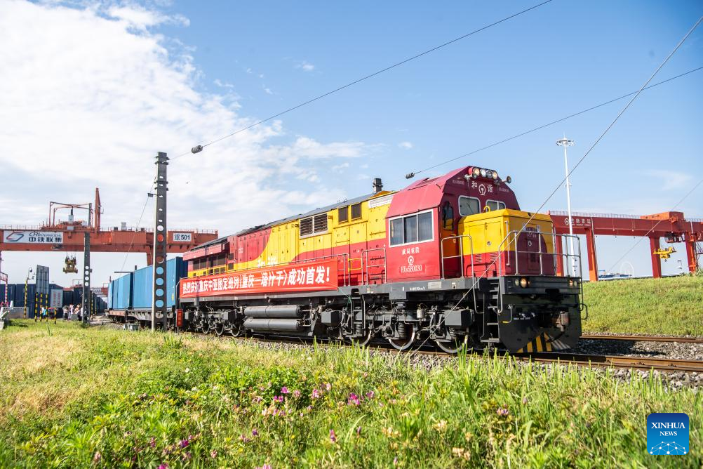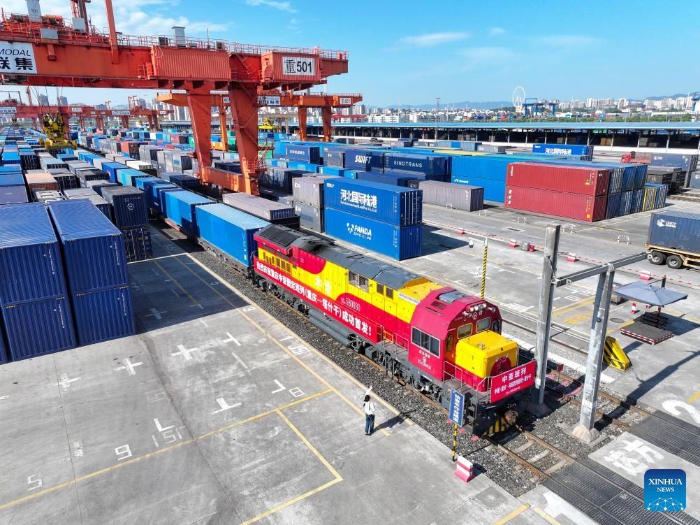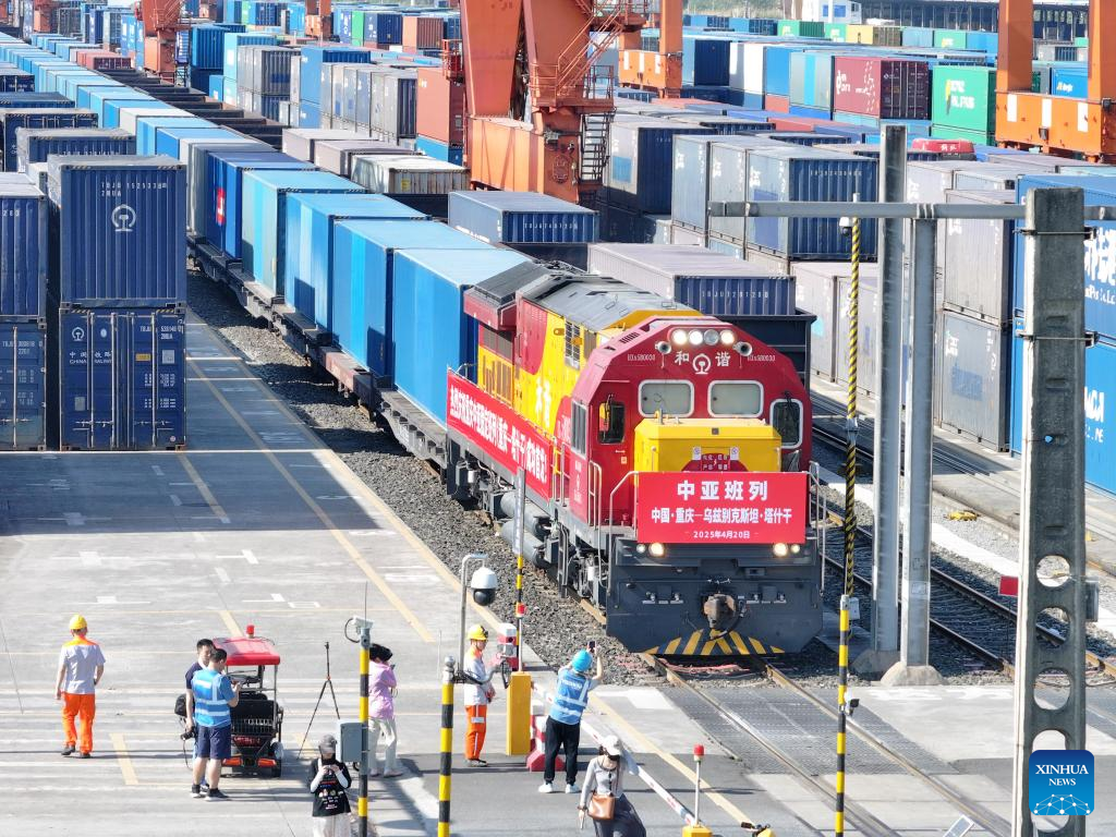 A China-Central Asia freight train departs from the Tuanjiecun Station in southwest China's Chongqing, April 20, 2025. (Xinhua/Tang Yi)