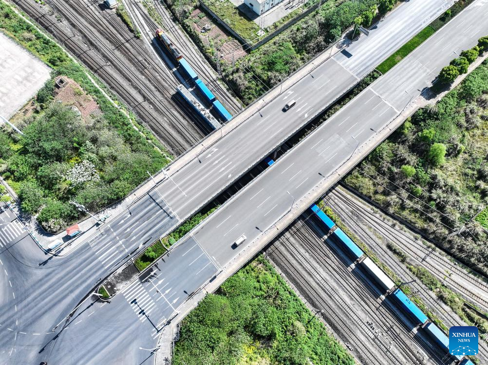 A drone photo taken on April 20, 2025 shows a China-Central Asia freight train waiting for departure at the Tuanjiecun Station in southwest China's Chongqing. A freight train, loaded with polyester chips made in southwest China's Chongqing, departed from the municipality on Sunday morning heading for Uzbekistan, marking the inauguration of a new regular freight train route from Chongqing to Central Asian countries. The train is expected to arrive in the Uzbek capital roughly 4,700 kilometers away in about 12 days. It will exit China through Horgos Port in Xinjiang and pass through Kazakhstan. Such regular services could ensure fast customs clearance, timely transportation and reduced costs, so as to guarantee cross-border transportation of better quality. (Xinhua/Tang Yi)