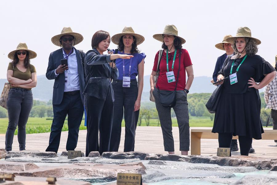 Guests attending the Third UNESCO High-Level Forum for Museums visit the Archaeological Ruins of Liangzhu City Park in Hangzhou, east China's Zhejiang Province, on April 23, 2025. (Xinhua/Jiang Han)