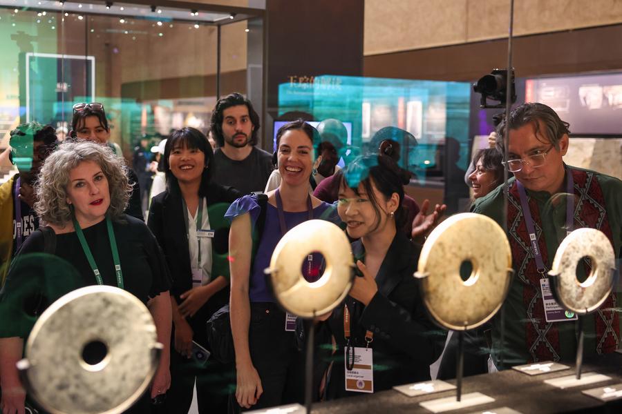Guests attending the Third UNESCO High-Level Forum for Museums visit the Liangzhu Museum in Hangzhou, east China's Zhejiang Province, on April 23, 2025. (Xinhua/Jiang Han)