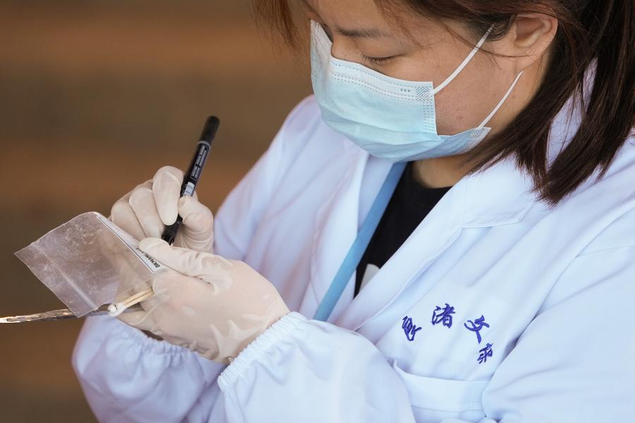 Researchers conducts a physical disease control experiment at a testing center of the Archaeological Ruins of Liangzhu City in Hangzhou, east China's Zhejiang Province, on April 18, 2025. (Xinhua/Weng Xinyang)
