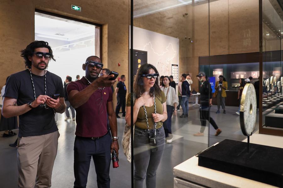 Guests attending the Third UNESCO High-Level Forum for Museums view exhibits of the Liangzhu Museum with AR glasses in Hangzhou, east China's Zhejiang Province, on April 23, 2025. (Xinhua/Jiang Han)