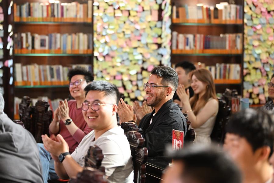 Raydis Franco (C) watches a Xiangsheng performance at a teahouse in Hongqiao District of north China's Tianjin, April 24, 2025. (Xinhua/Li Ran)