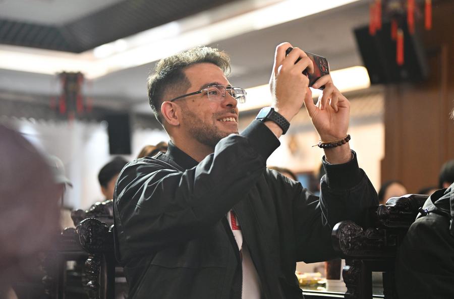 Raydis Franco watches a Xiangsheng performance at a teahouse in Hongqiao District of north China's Tianjin, April 24, 2025. (Xinhua/Li Ran)