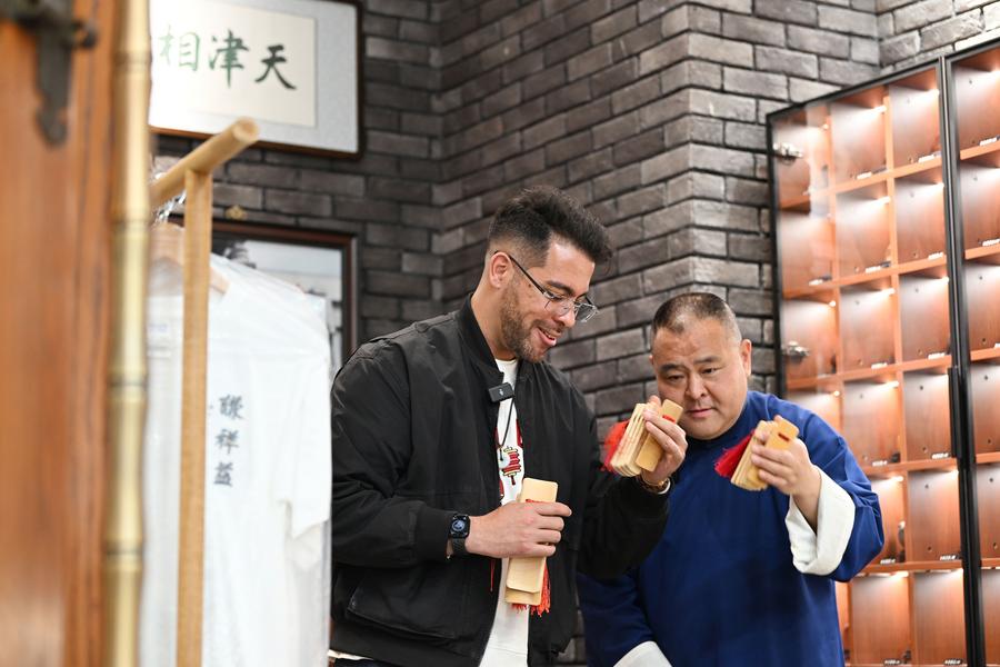 Raydis Franco (L) poses for photos with Ma Xiaochuan, the grandson of Ma Sanli, a renowned Xiangsheng performer, in Dongli District of north China's Tianjin, April 24, 2025. (Xinhua/Li Ran)