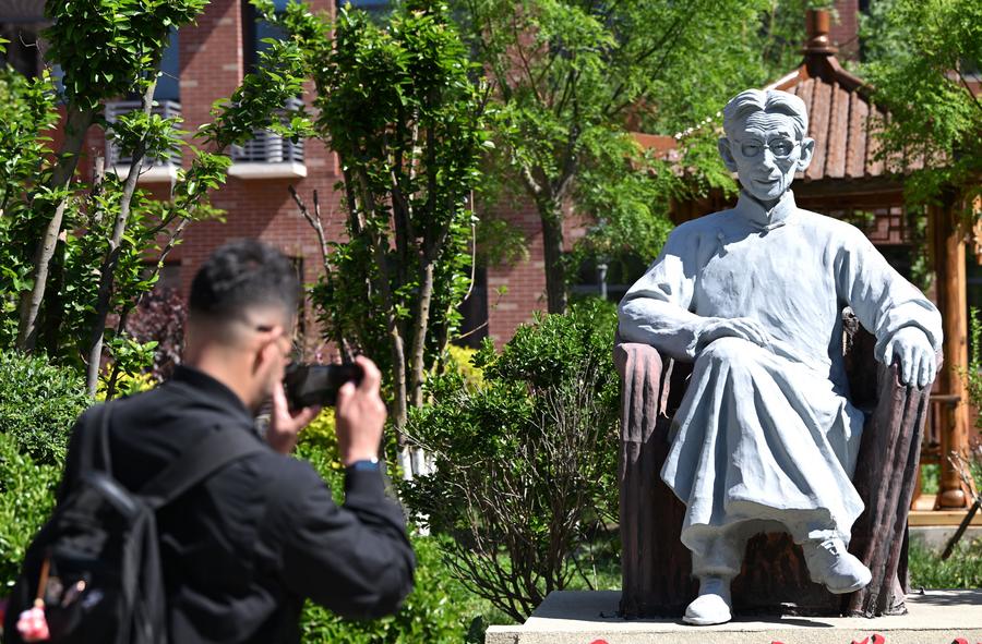 Raydis Franco takes photos of the statue of Ma Sanli, a renowned Xiangsheng performer, in Dongli District of north China's Tianjin, April 24, 2025. (Xinhua/Li Ran)