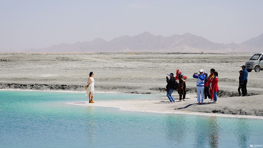 Tourists take pictures at Emerald Lake in Dachaidan town, Haixi Mongolian and Tibetan Autonomous Prefecture, northwest China's Qinghai Province. (People's Daily Online/Kuang Yu)