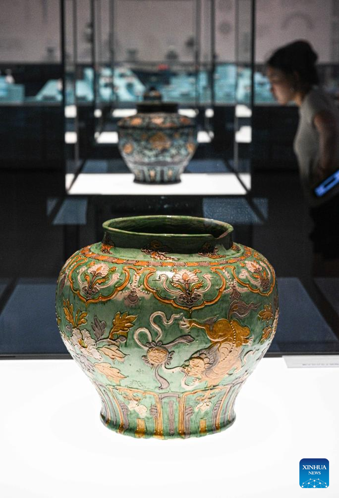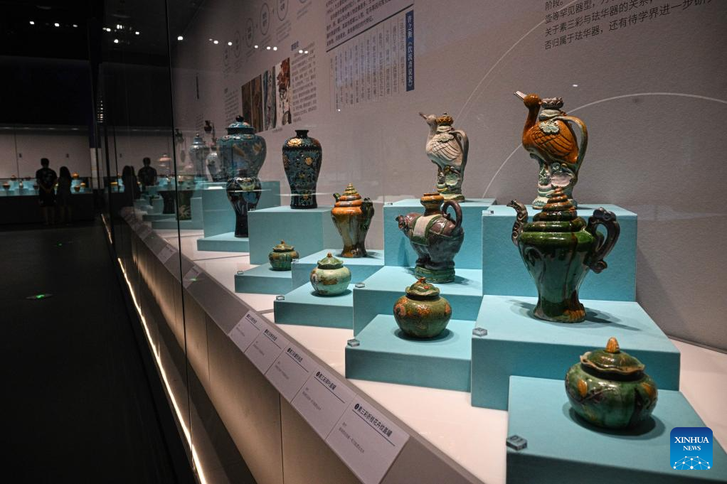This photo taken on June 12, 2025 shows ceramics displayed at the China (Hainan) Museum of the South China Sea in Qionghai, south China's Hainan Province. A great number of exhibits relevant to the Maritime Silk Road are showcased at the China (Hainan) Museum of the South China Sea, providing valuable insights into the prosperity of the Maritime Silk Road in ancient China and the exchanges between Chinese and foreign civilizations. (Xinhua/Pu Xiaoxu)
