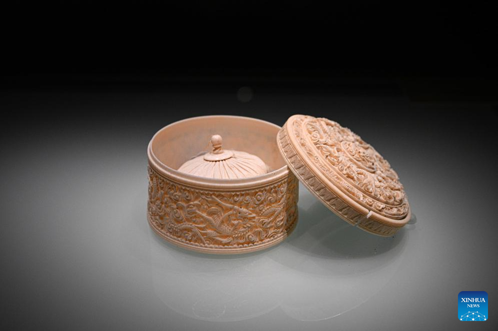 This photo taken on June 12, 2025 shows a carved ivory box with patterns of dragons and clouds displayed at the China (Hainan) Museum of the South China Sea in Qionghai, south China's Hainan Province. A great number of exhibits relevant to the Maritime Silk Road are showcased at the China (Hainan) Museum of the South China Sea, providing valuable insights into the prosperity of the Maritime Silk Road in ancient China and the exchanges between Chinese and foreign civilizations. (Xinhua/Pu Xiaoxu)