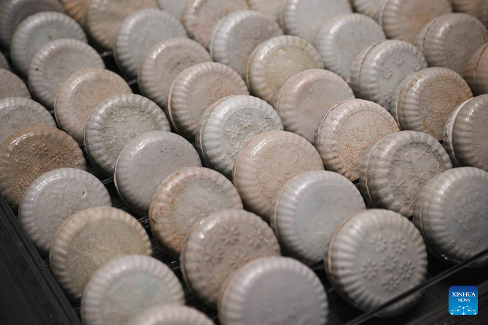 This photo taken on June 12, 2025 shows the bluish-white-glazed powder boxes decorated with chrysanthemum pattern displayed at the China (Hainan) Museum of the South China Sea in Qionghai, south China's Hainan Province. A great number of exhibits relevant to the Maritime Silk Road are showcased at the China (Hainan) Museum of the South China Sea, providing valuable insights into the prosperity of the Maritime Silk Road in ancient China and the exchanges between Chinese and foreign civilizations. (Xinhua/Pu Xiaoxu)