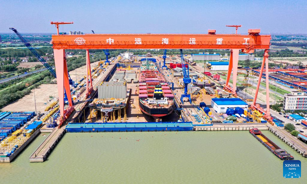 This photo taken on June 16, 2025 shows the working site of Cosco Shipping Heavy Industry Co., Ltd. in Yangzhou, east China's Jiangsu Province. China's value-added industrial output expanded 5.8 percent year on year in May. China's economy continued to expand steadily in May, supported by ongoing policy measures that helped sustain recovery amid global uncertainties, official data showed on Monday. (Photo by Ren Fei/Xinhua)