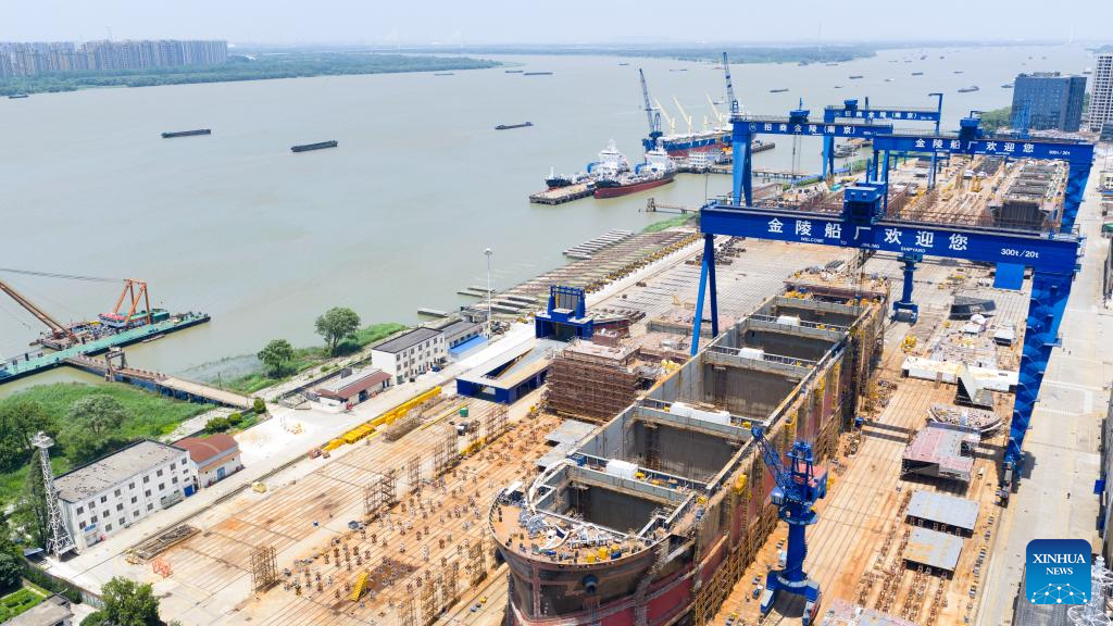 An aerial drone photo taken on June 16, 2025 shows the Jinling Shipyard in Nanjing, east China's Jiangsu Province. China's value-added industrial output expanded 5.8 percent year on year in May. China's economy continued to expand steadily in May, supported by ongoing policy measures that helped sustain recovery amid global uncertainties, official data showed on Monday. (Photo by Yang Suping/Xinhua)