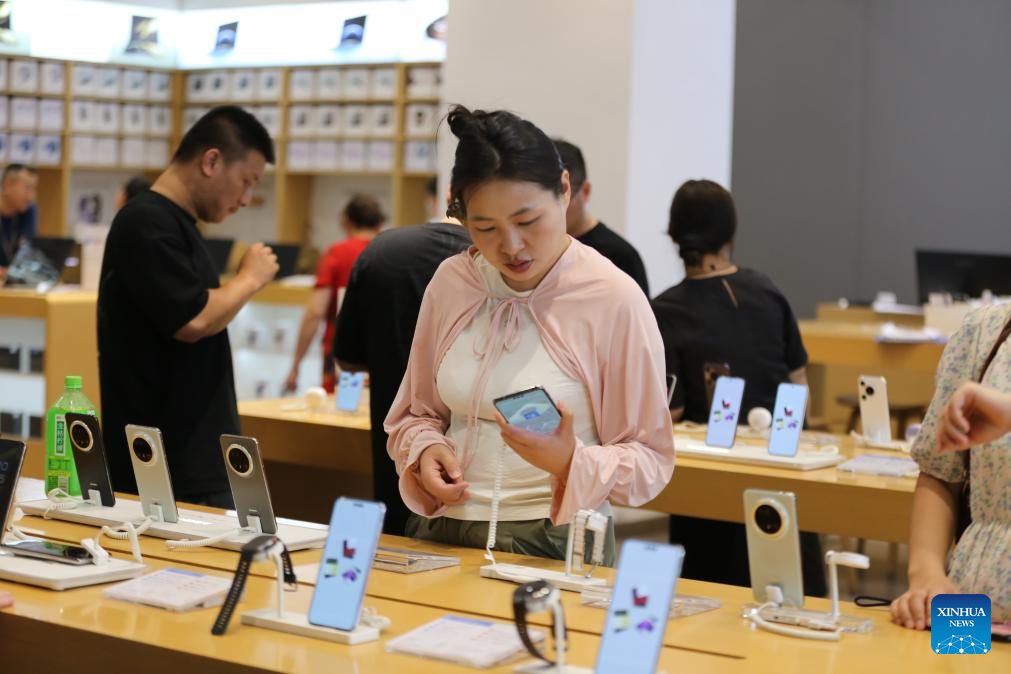A customer selects products at a cellphone shop in Leshan City, southwest China's Sichuan Province, June 15, 2025. China's retail sales of consumer goods, a major indicator of the country's consumption strength, expanded 6.4 percent year on year in May.