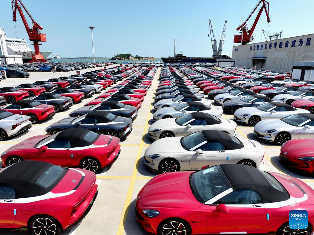 A drone photo taken on June 16, 2025 shows vehicles to be transported in Lianyungang Port, east China's Jiangsu Province. China's economy continued to expand steadily in May, supported by ongoing policy measures that helped sustain recovery amid global uncertainties, official data showed on Monday. (Photo by Wang Chun/Xinhua)