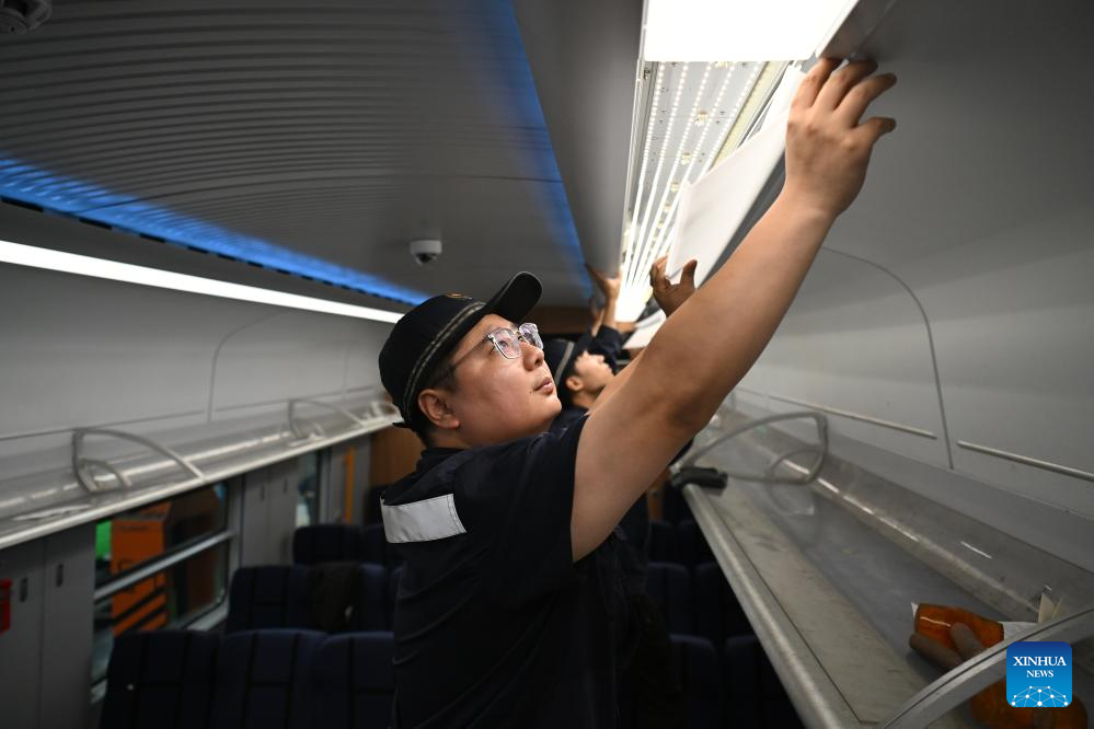 Staff members examine and maintain a train at a depot of China Railway Taiyuan Group Co., Ltd. in Taiyuan, north China's Shanxi Province, June 17, 2025. Staff memebers of China Railway Taiyuan Group Co., Ltd. has stepped up maintenance of trains to ensure safe travel for the upcoming summer travel rush. (Xinhua/Zhan Yan)