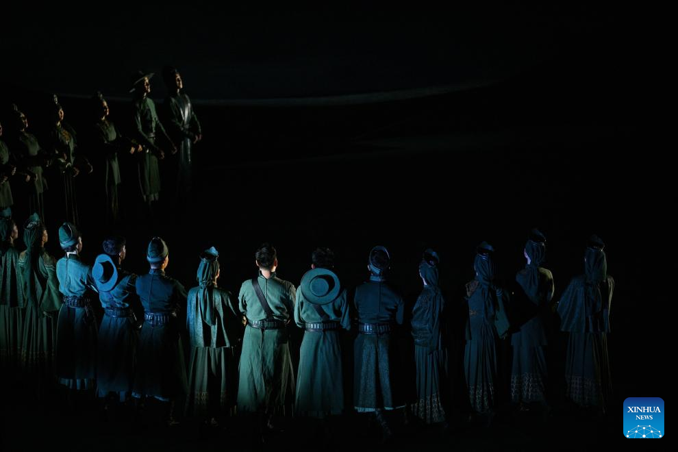 Artists perform a dance drama during the 7th China Xinjiang International Dance Festival at the Xinjiang People's Hall in Urumqi, capital of northwest China's Xinjiang Uygur Autonomous Region, July 20, 2025. The 7th China Xinjiang International Dance Festival opened here on Sunday, featuring 52 performances over 17 days until Aug. 5. (Xinhua/Xin Yuewei)