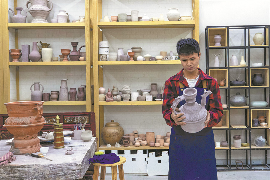 A potter looks at the finished product after a process that involved clay selection, sculpting and coloring. JIANG FAN/TENZING NIMA QADHUP/XINHUA