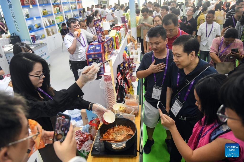 A visitor tastes Luosifen at a booth of the 22nd China-ASEAN Expo in Nanning, south China's Guangxi Zhuang Autonomous Region, Sept. 17, 2025. Luosifen, or river snail rice noodles, drew attention and popularity at the ongoing 22nd China-ASEAN Expo.