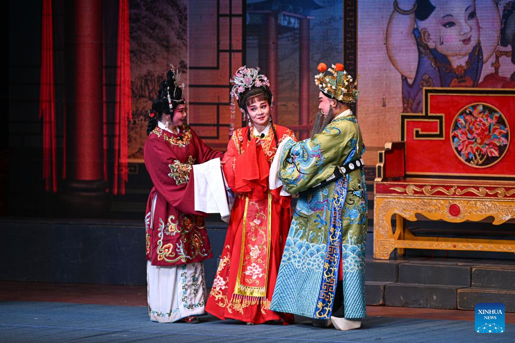 Actors perform Qiong Opera in Dazhipo Town of Haikou City, south China's Hainan Province, Sept. 21, 2025. The Dazhipo Qiong Opera cultural season was launched here and will last until mid-October this year. Qiong Opera, one of China's national intangible cultural heritages, has gained great popularity among local residents. (Xinhua/Pu Xiaoxu)