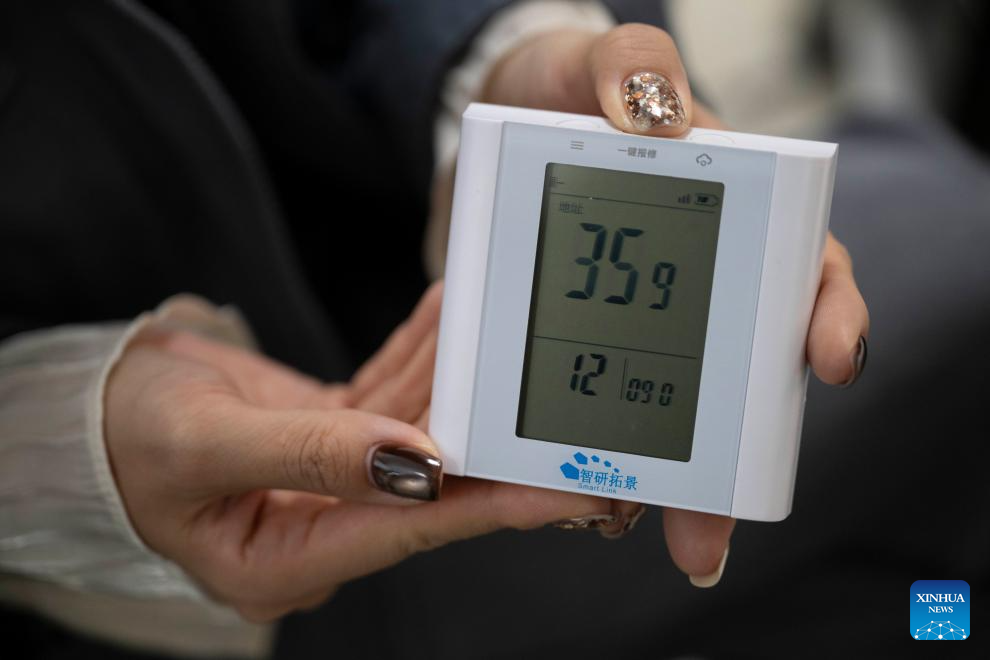 A resident displays a device with one-click repair report function in Harbin, northeast China's Heilongjiang Province, Oct. 20, 2025. Harbin, China's northernmost provincial capital, entered its heating season on Monday. Residents are now benefiting from improved heating services following an upgrade to the heating system. (Xinhua/Zhang Tao)
