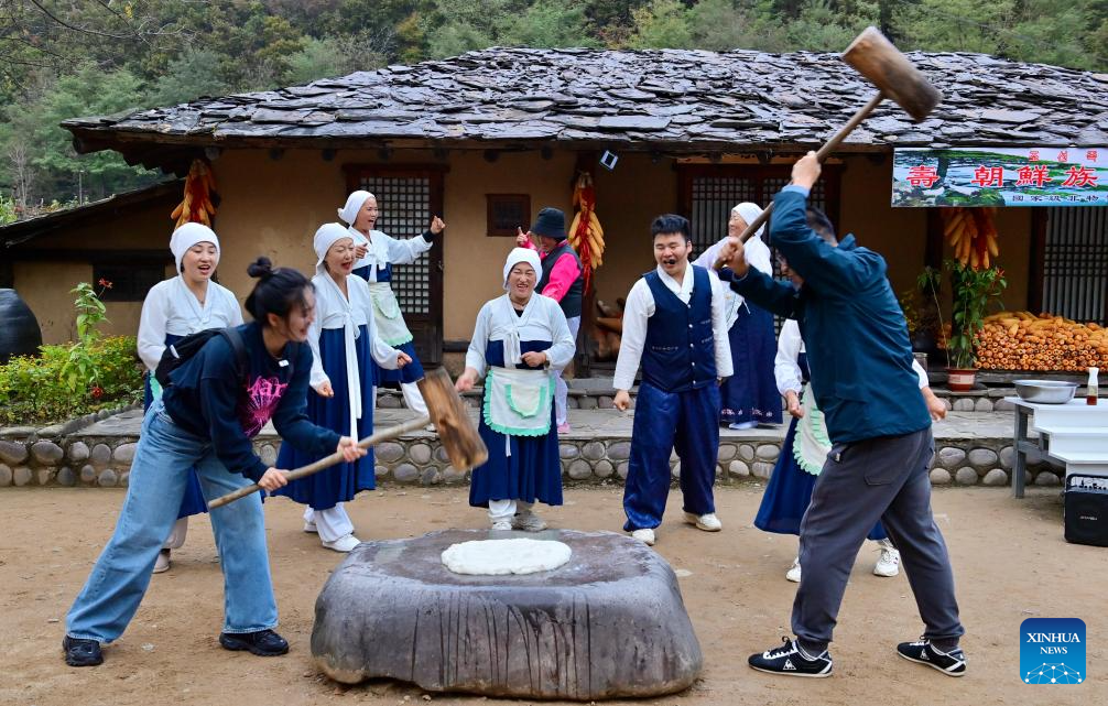 Tourists (front) experience making race cakes at a korean folk village in Dandong City, northeast China's Liaoning Province, Oct. 12, 2025. The G331 national highway, with a total length of 9,333 kilometers from Dandong City of northeast China's Liaoning Province to Altay of northwest China's Xinjiang Uygur Autonomous Region, is the second longest national highway in China. It spans six provinces and autonomous regions in northeast, north and northwest China, and is hailed as the "most beautiful border road".