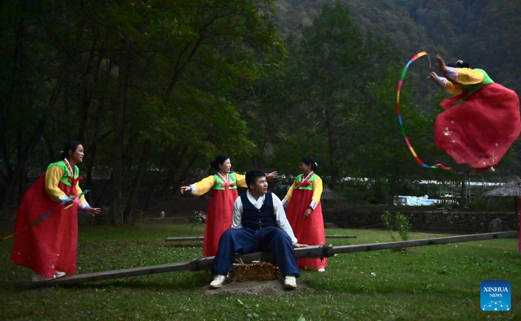 Villagers of Korean ethnic group perform seesaw jumping at a korean folk village in Dandong City, northeast China's Liaoning Province, Oct. 12, 2025. The G331 national highway, with a total length of 9,333 kilometers from Dandong City of northeast China's Liaoning Province to Altay of northwest China's Xinjiang Uygur Autonomous Region, is the second longest national highway in China. It spans six provinces and autonomous regions in northeast, north and northwest China, and is hailed as the "most beautiful border road".