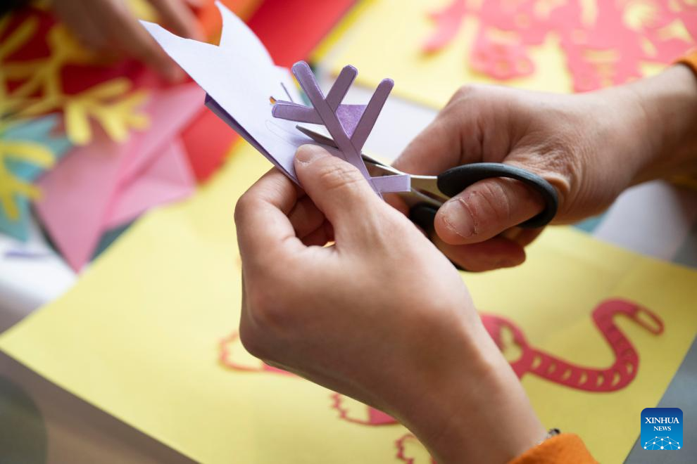 A passenger tries paper-cutting onboard the Train Y783 on Nov. 26, 2025. Train Y783, an ice-and-snow themed tourism train, was launched at Harbin Railway Station and started a six-day trip on Wednesday. The train showcases the charm of northeastern China through themed decorations, tour guide services and interactive activities, in an effort to promote winter tourism and inject new vitality into ice and snow economy. (Xinhua/Zhang Tao)