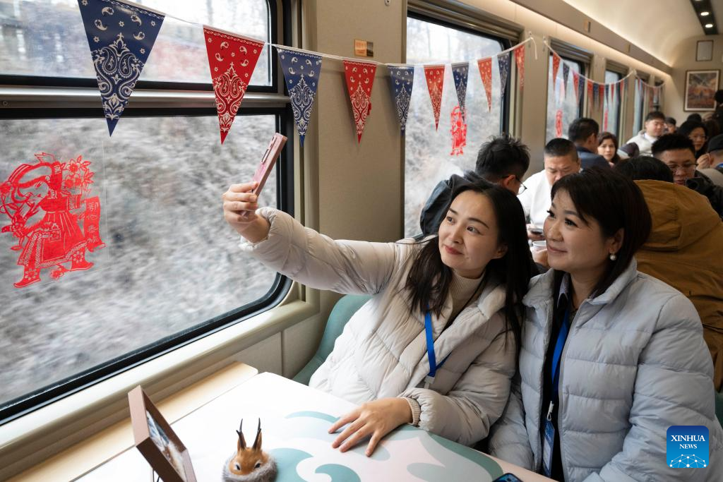 Passengers take photos onboard the Train Y783 on Nov. 26, 2025. Train Y783, an ice-and-snow themed tourism train, was launched at Harbin Railway Station and started a six-day trip on Wednesday. The train showcases the charm of northeastern China through themed decorations, tour guide services and interactive activities, in an effort to promote winter tourism and inject new vitality into ice and snow economy. (Xinhua/Zhang Tao)
