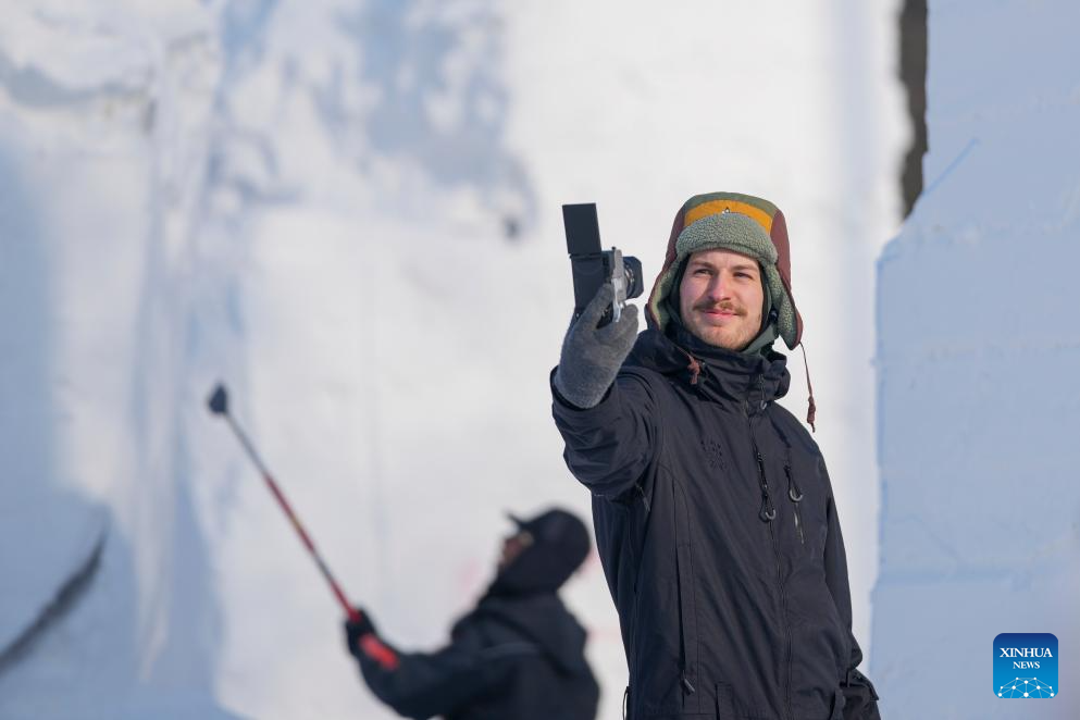 A contestant takes photos at the compound for the Sun Island International Snow Sculpture Art Expo in Harbin, northeast China's Heilongjiang Province, Jan. 6, 2026. The 28th Harbin international snow sculpture competition kicked off here on Tuesday, attracting 25 teams of snow sculptors from 13 countries. (Xinhua/Wang Jianwei)