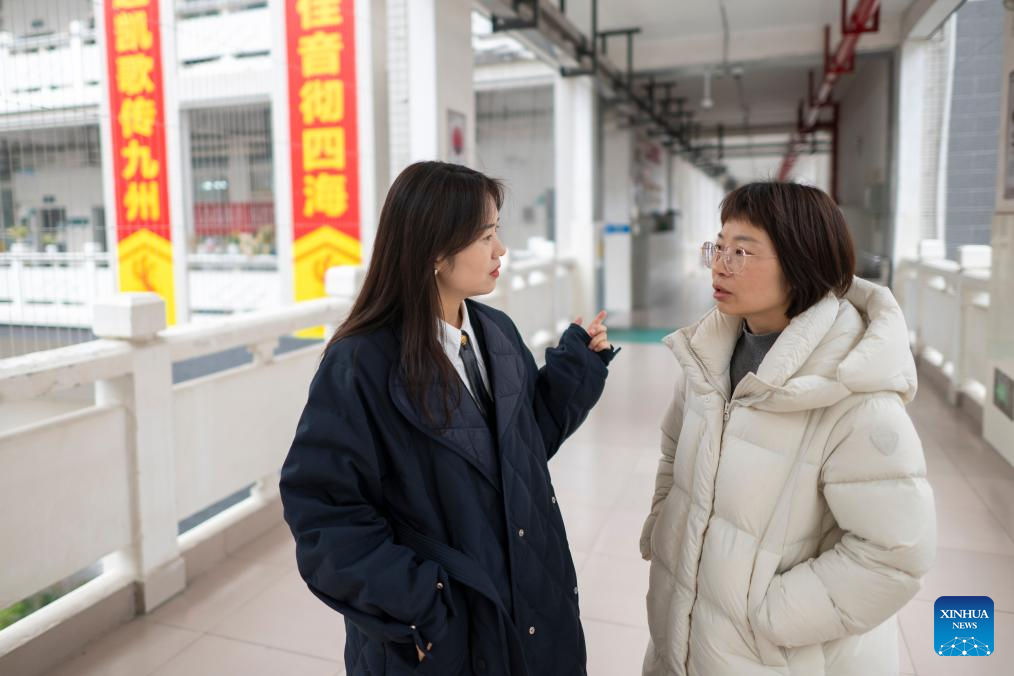 Zhang Qiongli talks with a colleague at Enshi Tujia and Miao Autonomous Prefecture Senior High School in Enshi, central China's Hubei Province, Feb. 3, 2026. (Xinhua/Wu Zhizun)